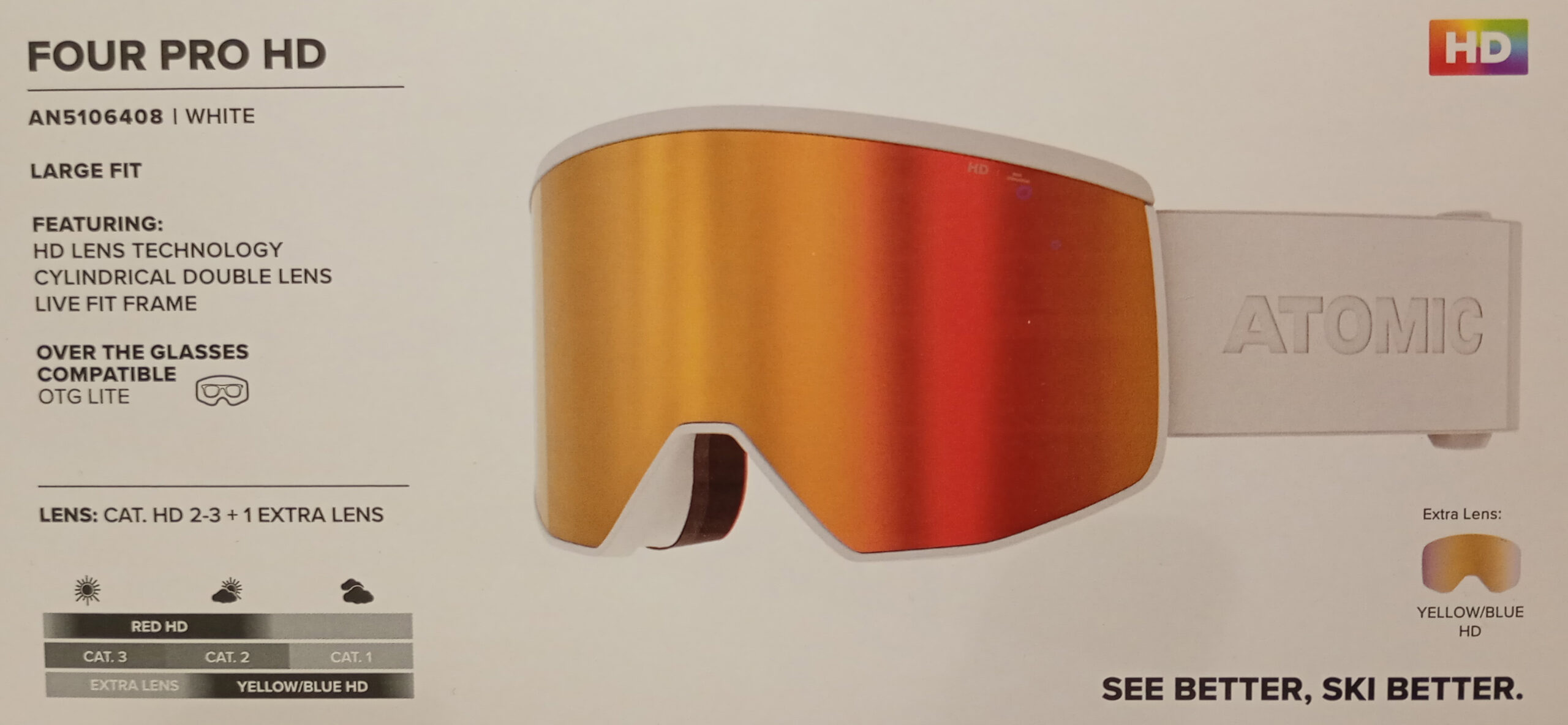 Lyžařské brýle ATOMIC FOUR PRO HD White Zorníky kategorie 2-3 Náhradní zorníky v balení: kategori 1-2 (Yellow / blue HD) Brýle Atomic Four Pro HD poskytují nebývalou viditelnost při jakémkoli dobrodružství na horách, ať už se chystáte na svah pokrytý prašanem, nebo na dokonale upravenou sjezdovku. Díky technologii zorníku HD Lens mikrokrystaly v zorníku rozkládají světlo do 6 spektrálních barev a zvýrazňují modrou a červenou, takže brýle poskytují neuvěřitelnou hloubku vidění a skvělou viditelnost za všech světelných podmínek. Brýle nabízejí obrovské zorné pole, zatímco systém utěsnění zorníku zabraňuje pronikání větru a vody, čímž eliminuje kondenzaci a zamlžování, a navíc usnadňuje výměnu zorníků. Rám Live Fit se přizpůsobí tvaru vašeho obličeje, aby vám brýle perfektně padly, a drážky OTG Lite v rámu umožňují nosit dioptrické brýle.