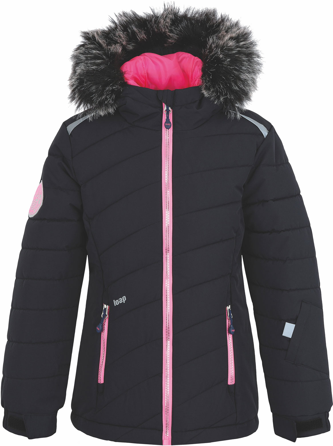 Slušivá dívčí lyžařská bunda Loap FUKSIE má klasický střih s mírně prodlouženým zadním dílem. Díky voděodolné a prodyšné membráně AQUA PRO snadněji odvádí pot a vlhkost od těla. Svrchní materiál STORMEX spolehlivě odolá sněhu, dešti i ostrému větru. Příjemná podšívka je ze 100% polyesteru taffeta a hřejivou výplň tvoří dutá vlákna POLYTHERM s výbornou tvarovou pamětí. Snadno se proto přizpůsobí tělu a rychle zahřejí. Tato zateplená lyžařská bunda je vybavena kostěnými zipy s metalickým efektem a hlavní zip má navíc krytí, které chrání bradu před studeným jezdcem a bolestivým skřípnutím kůže. Kapuce je pevná s umělou kožešinou. Rukávy mají kvalitní PVC stahování na suchý zip a vnitřní elastický rukáv. Spodní okraj bundy je nastavitelný. Sněhový pás je napevno přišitý a má poutka, která slouží k přichycení lyžařských kalhot. Na bocích jsou dvě kapsy na zip a jednu menší kapsu najdete na levém předloktí.