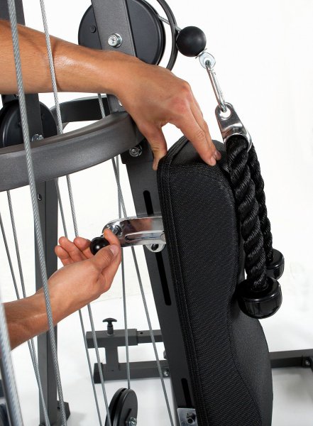 díky důmyslnému kladkovému systému na boku konstrukce je spektrum cviků mnohem šiřší oproti běžným věžím, výškově stavitelná protisměrná boční kladka otočná v rozsahu 160 ° pro maximální rozsah pohybu
