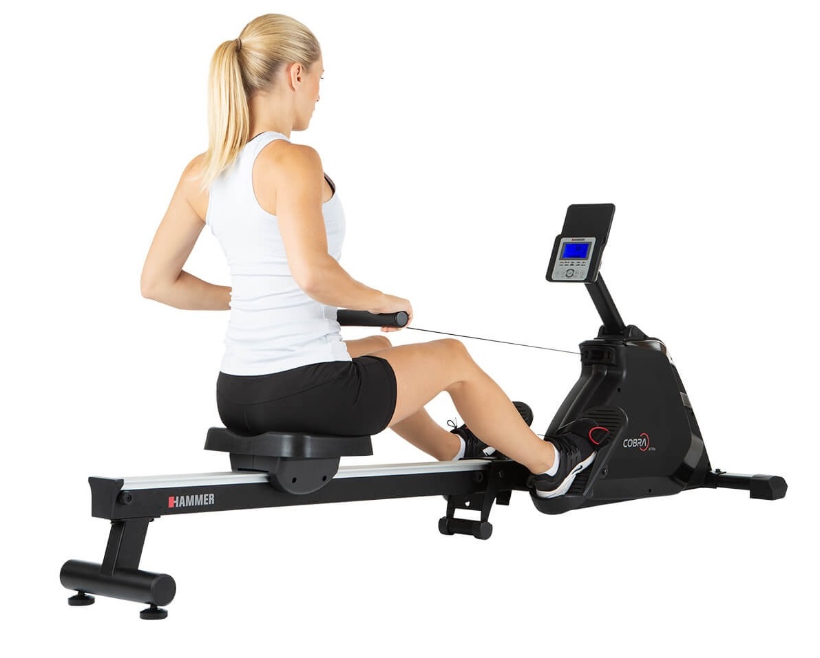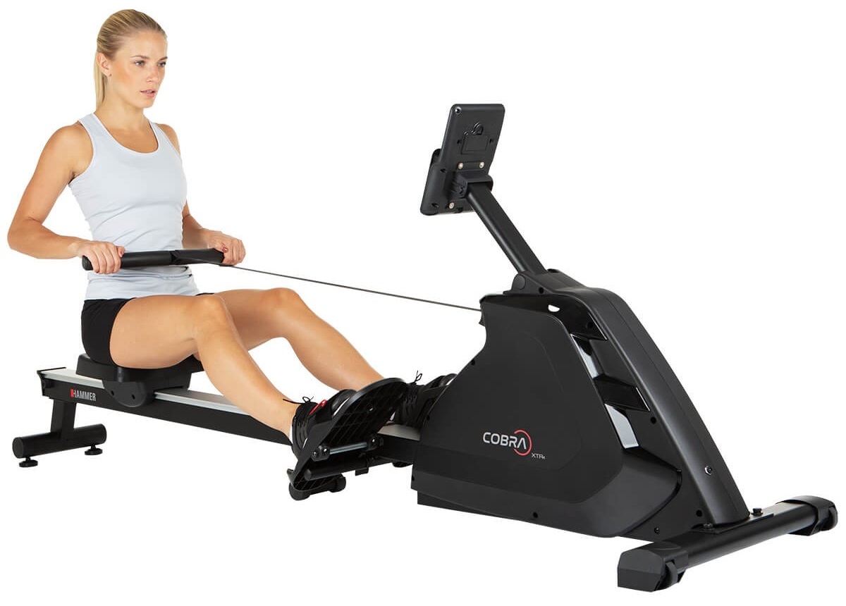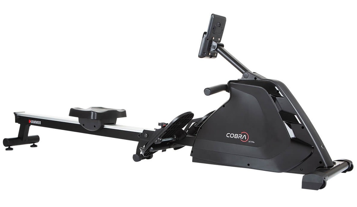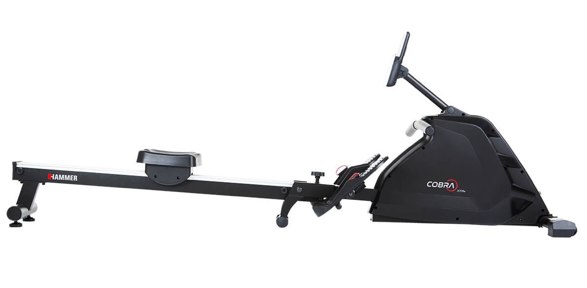 Hammer Rower Cobra XTR Plus II je skvělý veslovací trenažér určený pro domácí použití. Vyniká hliníkovou pojezdovou lištou, pohodlným ergonomicky tvarovaným sedlem, protiskluzovými nášlapy s nastavitelnými řemínky a praktickým tréninkovým počítačem s nastavitelným sklonem a výškou. Je vybaven tichou magnetickou brzdou, precizně provedenou mechanikou a kvalitními komponenty. Díky setrvačníku o hmotnosti 8 kg má stroj naprosto plynulý a komfortní chod.