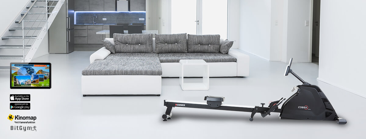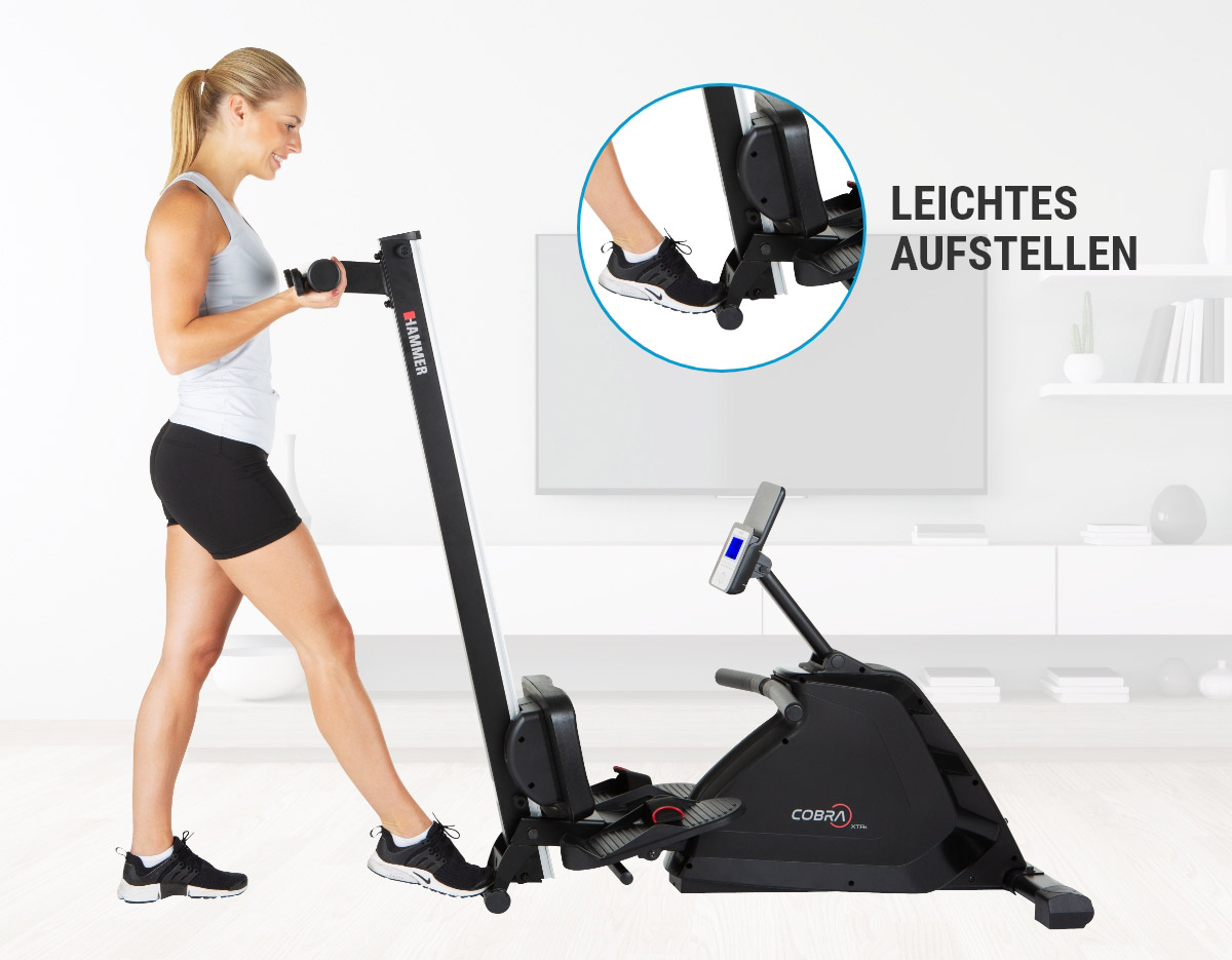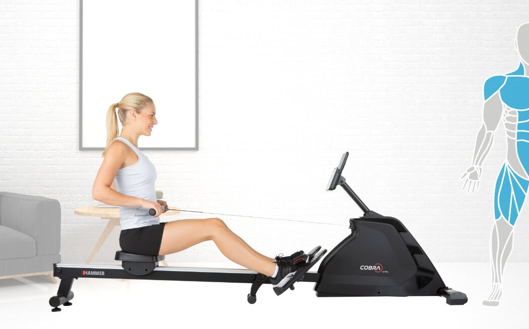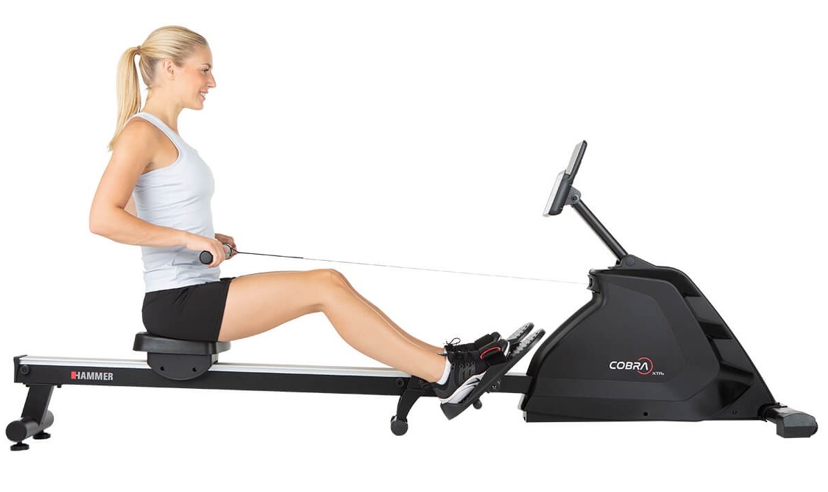 Hammer Rower Cobra XTR Plus II je skvělý veslovací trenažér určený pro domácí použití. Vyniká hliníkovou pojezdovou lištou, pohodlným ergonomicky tvarovaným sedlem, protiskluzovými nášlapy s nastavitelnými řemínky a praktickým tréninkovým počítačem s nastavitelným sklonem a výškou. Je vybaven tichou magnetickou brzdou, precizně provedenou mechanikou a kvalitními komponenty. Díky setrvačníku o hmotnosti 8 kg má stroj naprosto plynulý a komfortní chod.